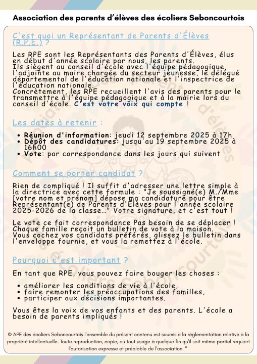 Réunion d’informations du 12/09/2025 !! Élections des Représentants de Parents d'Élèves de l'École de Seboncourt !!